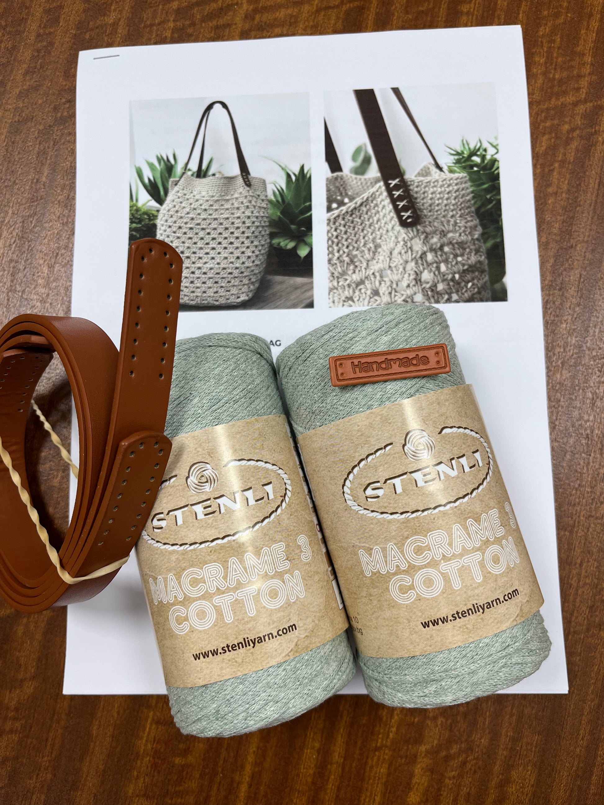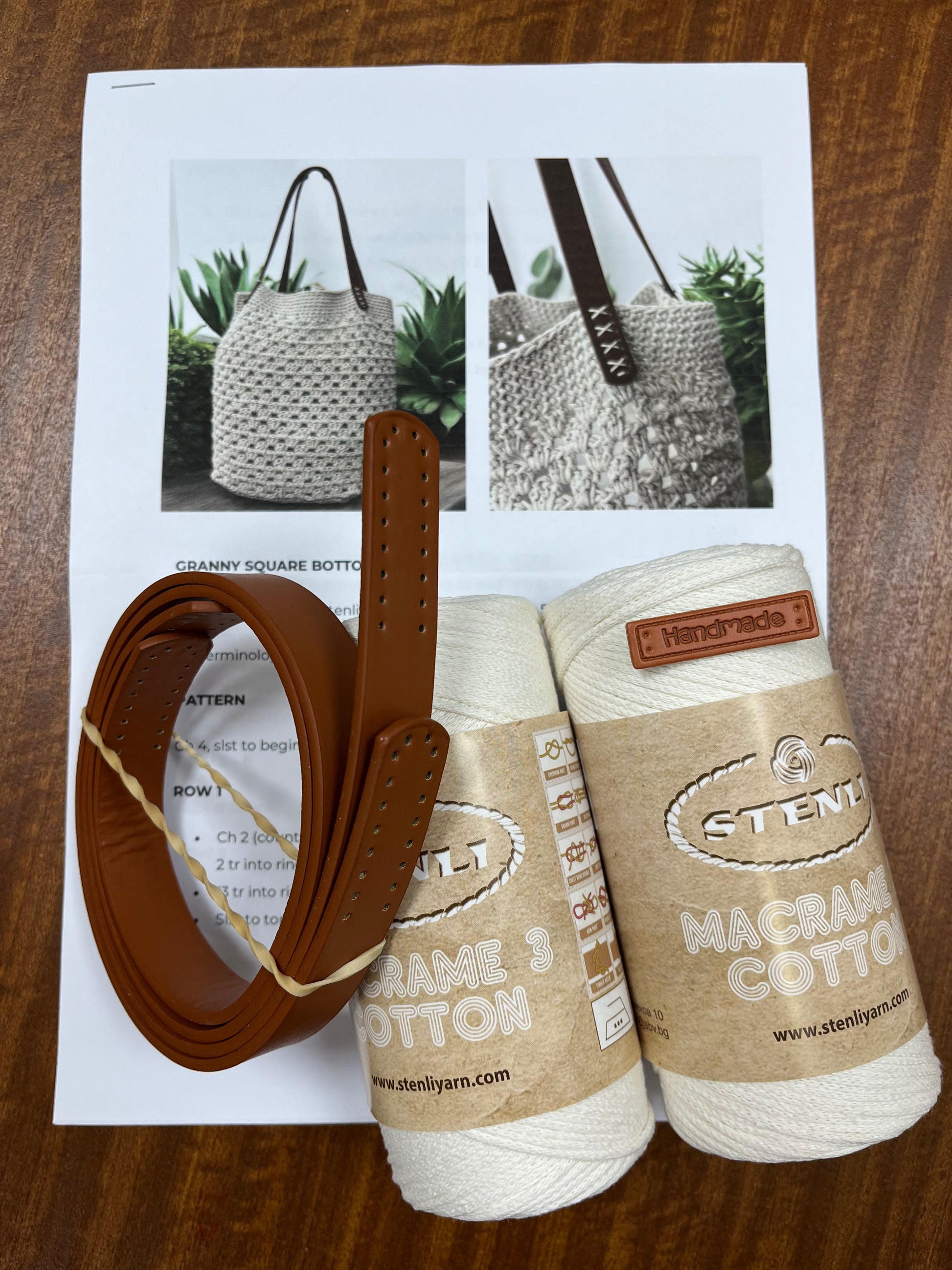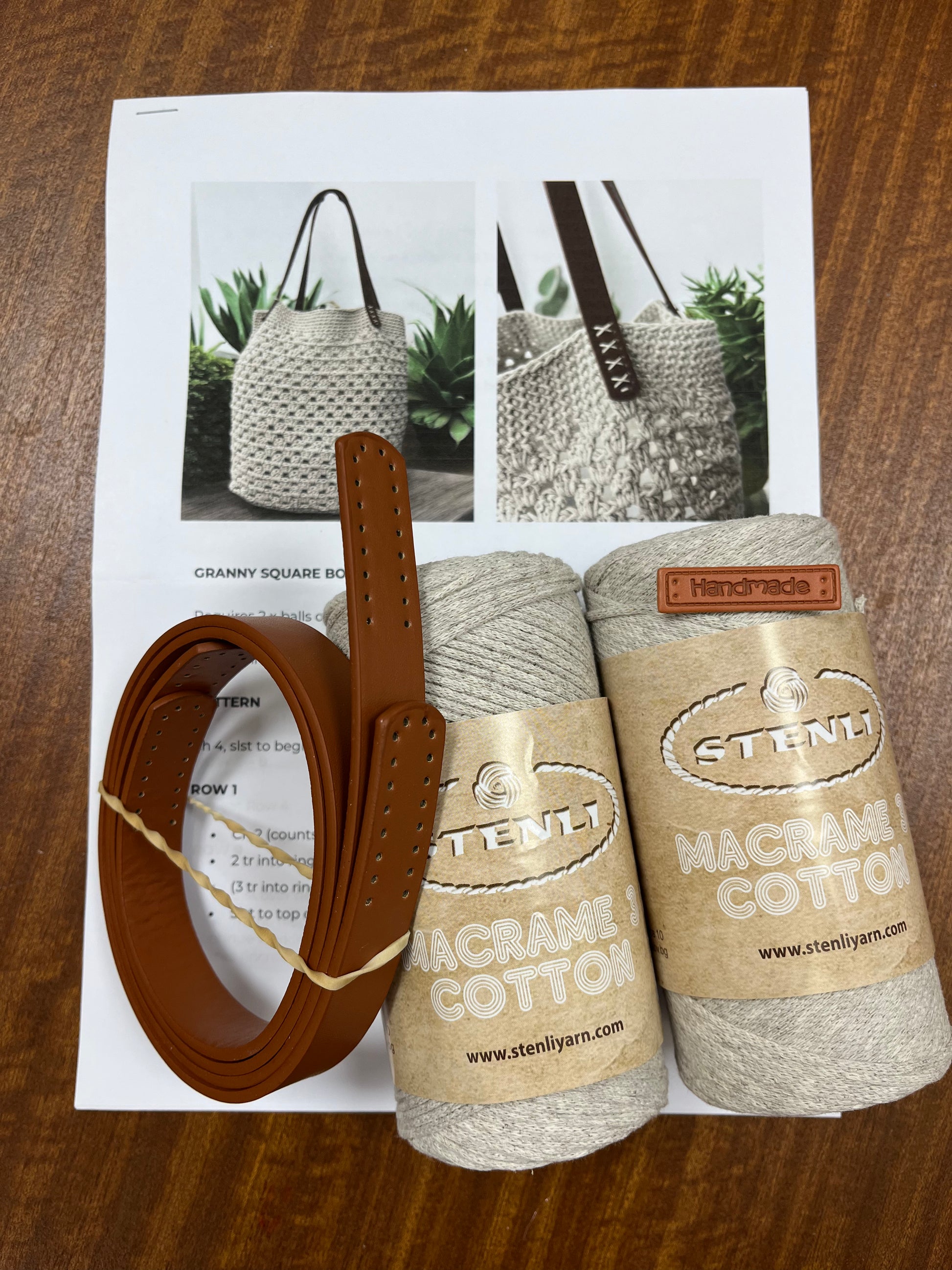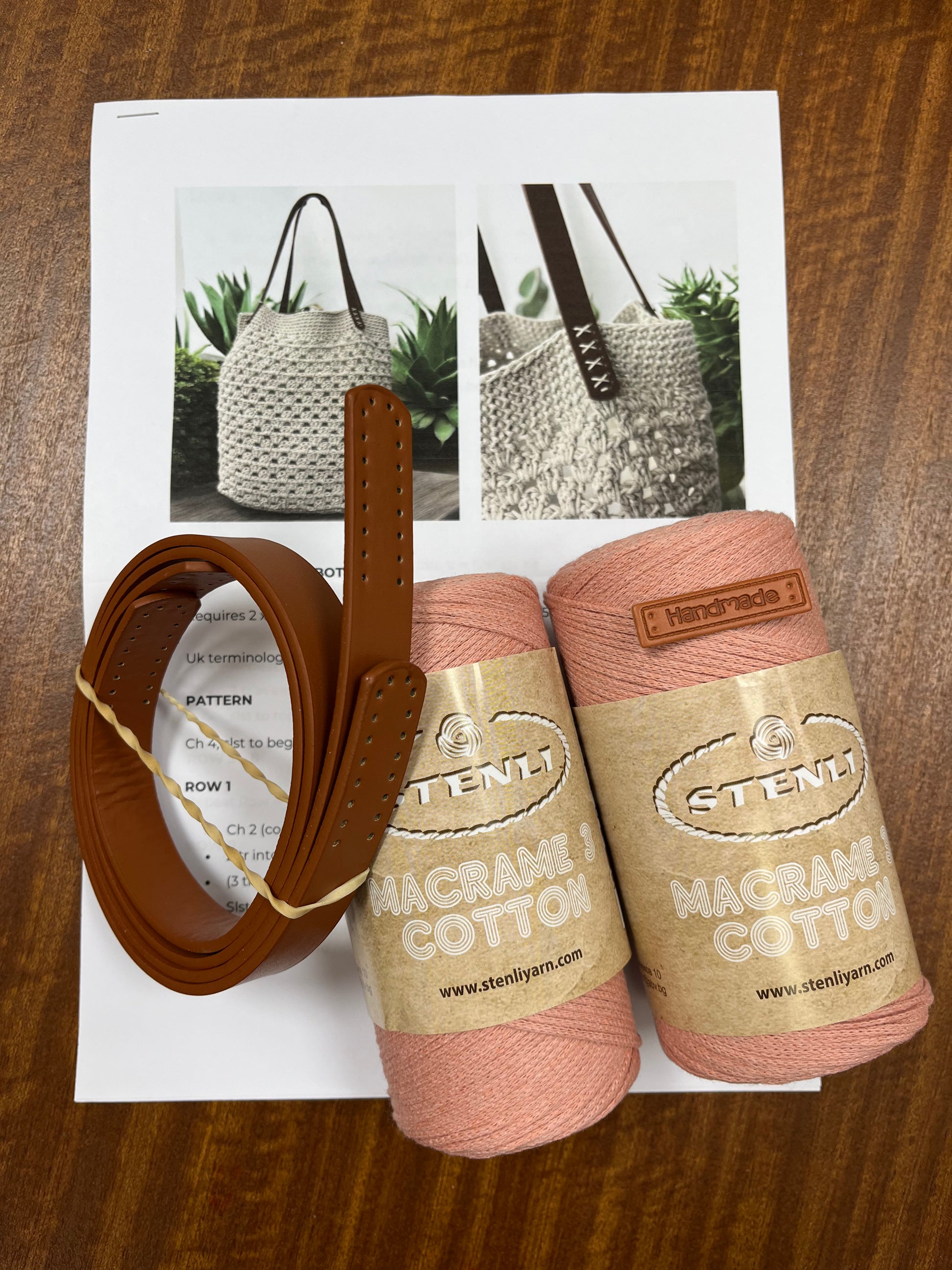 Included in kit is a UK terminology pattern, pair of faux leather handles, “handmade” sew on label and 2 x balls of Stenli Macramé 3 cotton yarn.